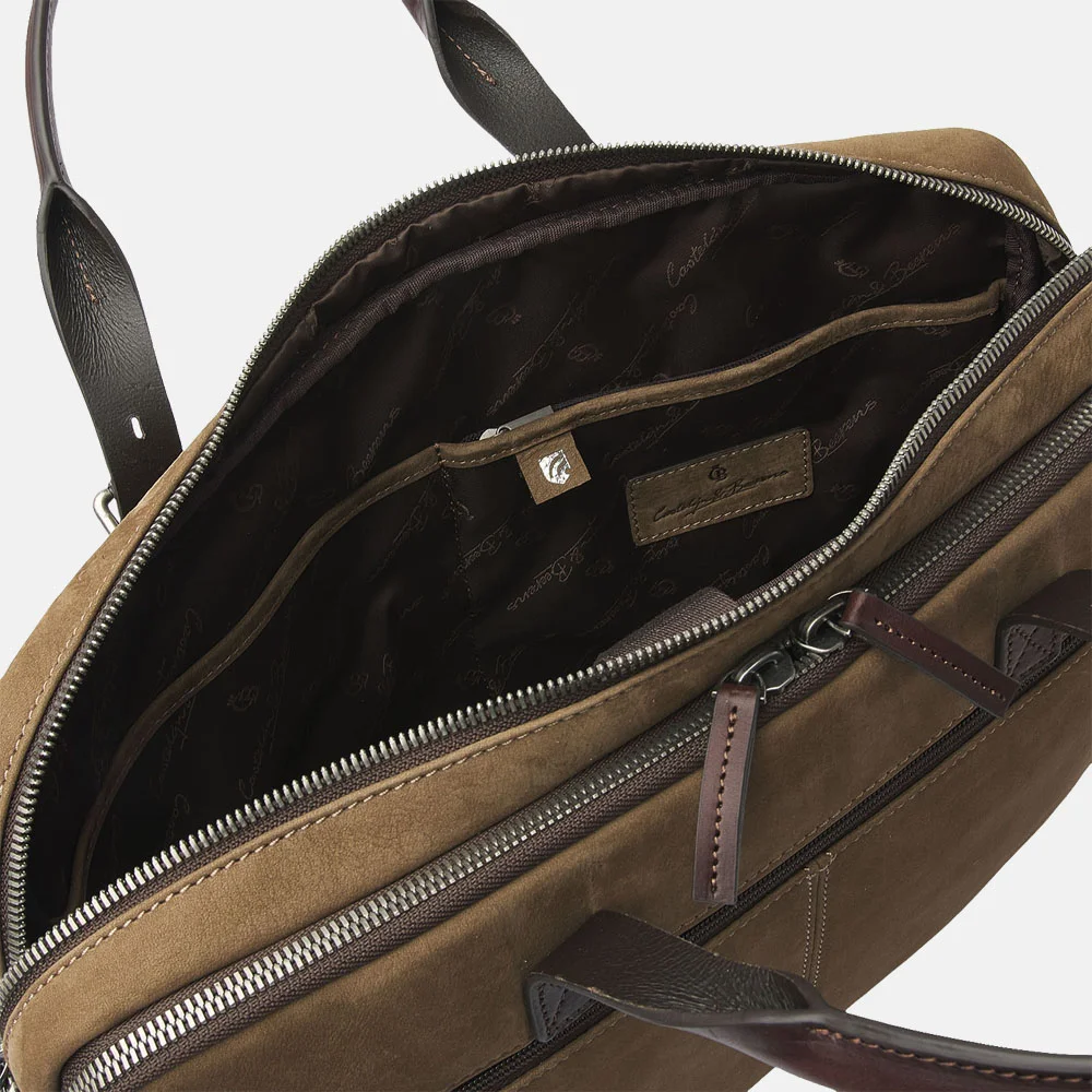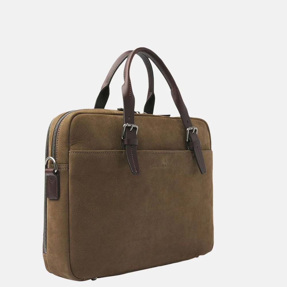Deze laptoptas van Castelijn en Beerens is gemaakt van Italiaans nubuck leer en straalt klasse en een vleugje elegantie uit. Perfect voor iedere zakenman die netjes op zijn afspraken en werk wilt verschijnen. In de laptoptas kun je jouw laptop van 15 inch kwijt in het schokabsorberende laptopvak en nog diverse belangrijke A4 documenten. Je kunt deze laptoptas dragen aan de hand van de vaste handvatten of maak gebruik van de verstelbare schouderband. Daarnaast kun je de laptoptas ook meenemen aan je handbagage - of reiskoffer tijdens je business trip. Er is namelijk een bevestigingsband aanwezig voor de trekstang. Jouw belangrijke pasjes zijn ook goed beveiligd in het ritsvak, deze is namelijk voorzien van RFID-bescherming. Dit houdt in dat ze je niet kunnen skimmen, veilig hé. Doordat de laptoptas is gemaakt van leer en een tijdloos ontwerp heeft kun je jaren vooruit. Maak jij het jezelf gemakkelijk tijdens je werkavonturen met deze Castelijn en Beerens laptoptas? De eigenschappen van deze laptoptas zijn: * Hoofdvak met ritssluiting * Laptopvak 15 inch * Insteekvak * Ritsvak * Voorvak met druksluiting * Twee achtervakken met ritssluiting * Bevestigingsband achterzijde in achtervak met ritssluiting * Twee vaste handvatten * Afneembare en verstelbare schouderband * Zilverkleurige hardware