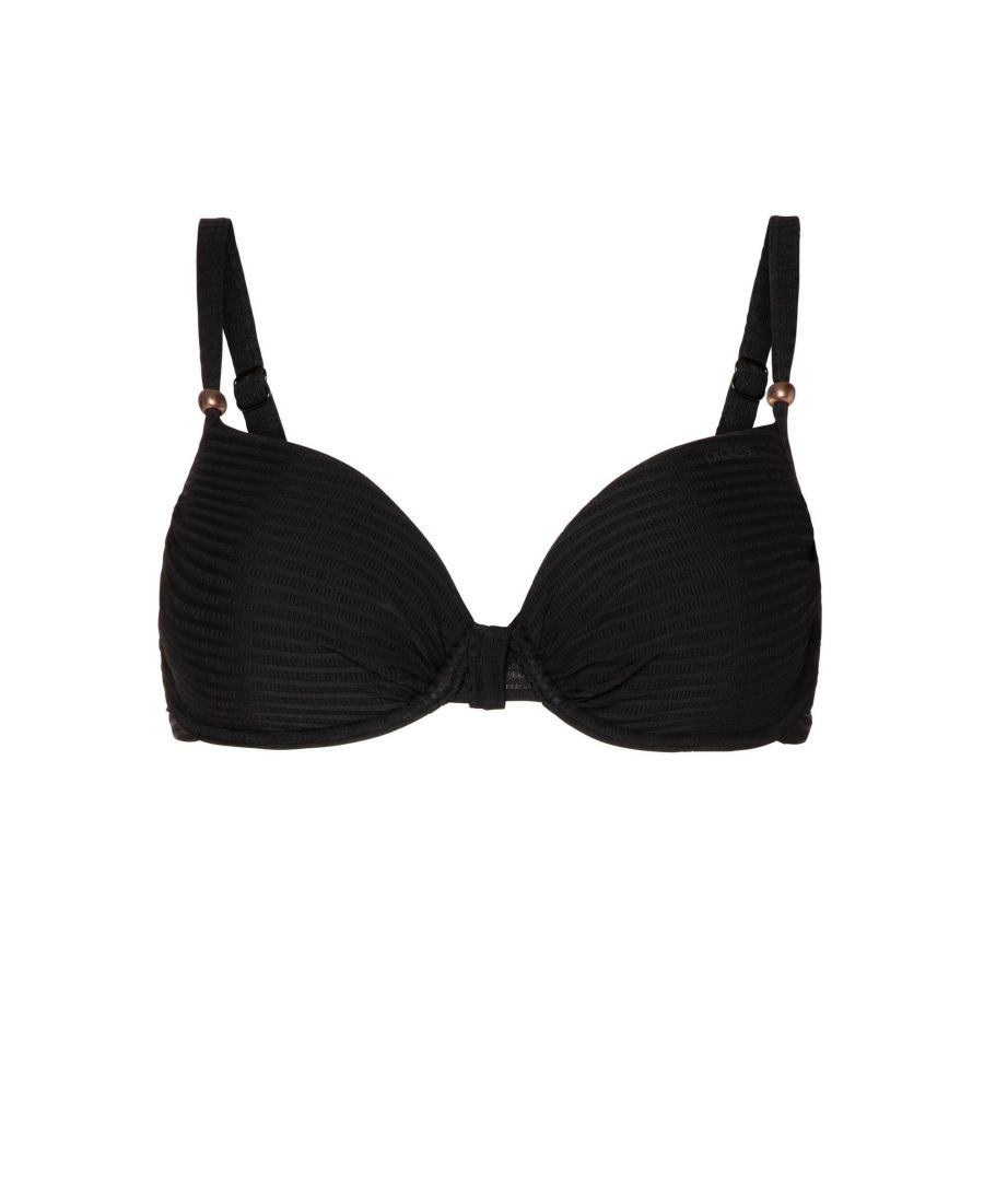 Maak kennis met de MIXHART beugelbikinitop van Protest. Deze fantastische bikinitop is gemaakt van een gestructureerde zwarte stof. De MIXHART maakt deel uit van onze Mix & Match-serie, wat inhoudt dat deze kan worden gecombineerd met verschillende bikinibroekjes uit onze collectie. Deze top is speciaal gemaakt voor vrouwen met een grotere cupmaat en is voorzien van beugels en ingebouwde foam cups voor extra ondersteuning. De schouderbandjes met kraaltjes zijn verstelbaar zodat je de perfecte pasvorm kunt creëren. De stof is PFC-vrij om het gebruik van deze chemische stof te verminderen en daarmee de schade aan het milieu te beperken. Veel plezier in je MIXHART van Protest!