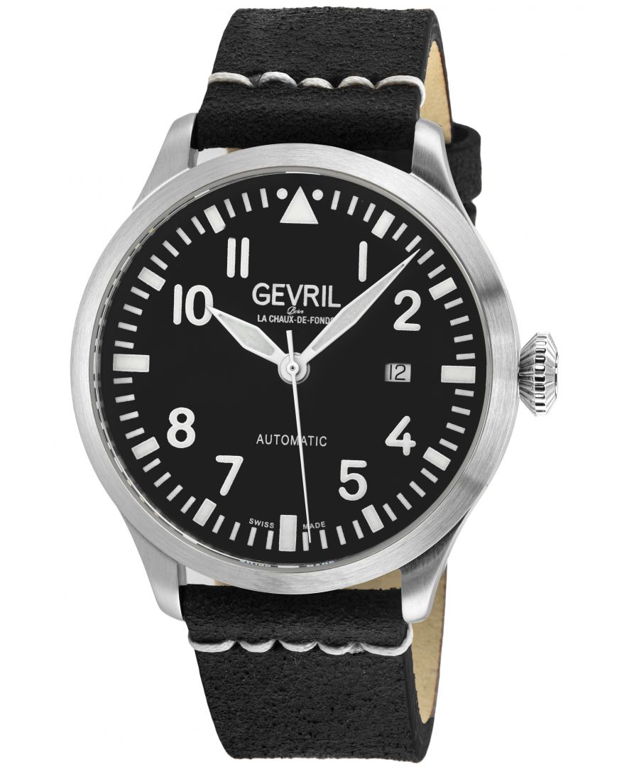 Gevril 43502 Vaughn Zwitsers automatisch herenhorloge Gevril Zwitsers automatisch herenhorloge uit de Vaughan-collectie 44 mm ronde kast van 316L roestvrij staal, zwarte wijzerplaat, lichtgevende wijzers Datum op 3 uur, achterkant tentoonstellingskast Push Pull kroon Echte Italiaanse zwarte lederen band met tanggesp Antireflecterend saffierkristal Waterbestendig tot 50 meter/5ATM Swiss Made automatisch, Sellita SW200 uurwerk
