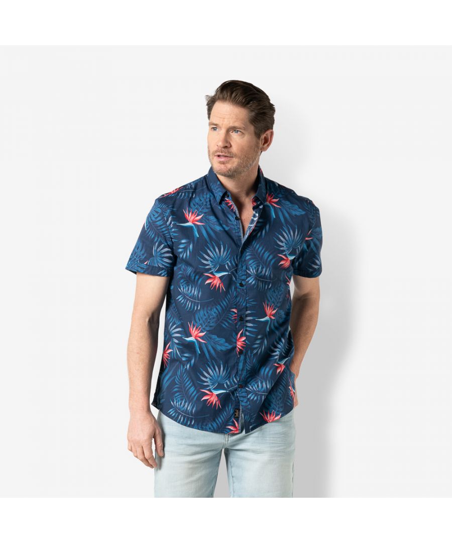 Dit overhemd met korte mouw, is gemaakt 97% BCI katoen en 3% elastan. Door de stretch heeft dit shirt een comfortabele regular fit. De kraag is button down (verborgen), en heeft een zomerse print. De onderste knoop is aangezet met een contrast garen en ook het knoopsgat is met een contrast kleur gestikt. Achterop de kraag bevindt zich ook een kleine knoop.