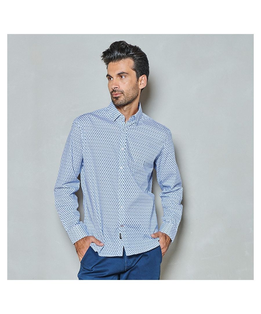 Dit overhemd met lange mouw, is gemaakt 97% BCI katoen en 3% elastan. Door de stretch heeft dit shirt een comfortabele regular fit. De kraag is button down (verborgen) en heeft een subtiel printje. De onderste knoop is aangezet met een contrast garen en ook het knoopsgat is met een contrast kleur gestikt. Achterop de kraag bevindt zich ook een kleine knoop. Binnenin de kraag en manchet bevindt zich een contrast piping. Ons model is 1,88 en draagt maat M