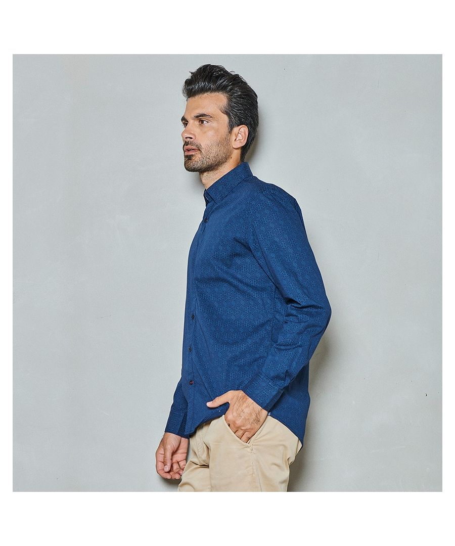 Dit overhemd met lange mouw, is gemaakt 97% BCI katoen en 3% elastan. Door de stretch heeft dit shirt een comfortabele regular fit. De kraag is button down (verborgen), heeft chambray accenten en een subtiel printje. De onderste knoop is aangezet met een contrast garen en ook het knoopsgat is met een contrast kleur gestikt. Achterop de kraag bevindt zich ook een kleine knoop. Ons model is 1,88 en draagt maat M