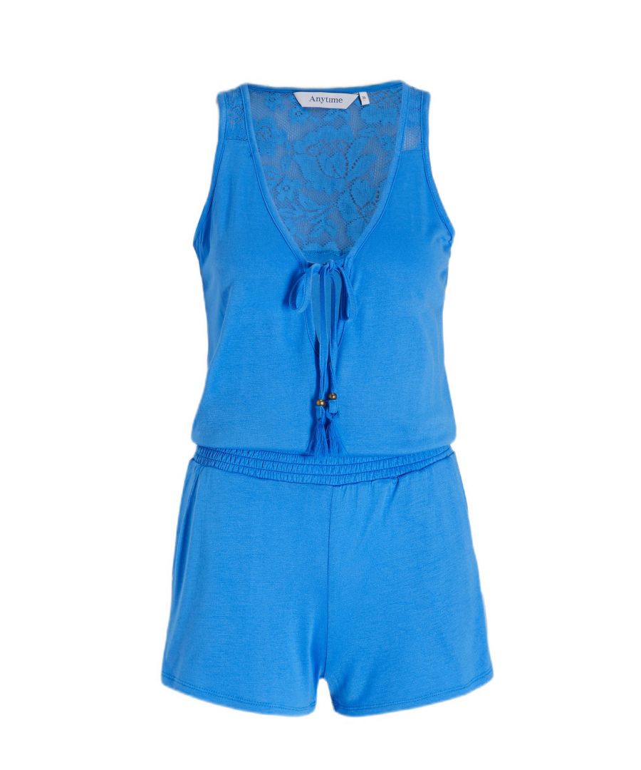 Deze playsuit van anytime is gemaakt van een viscosemix. De playsuit heeft een v-hals en heeft een kanten achterkant. Ons model is 175 cm lang en draagt maat 36.Deze jumpsuit is verkrijgbaar in de volgende maten: 36 t/m 46.
