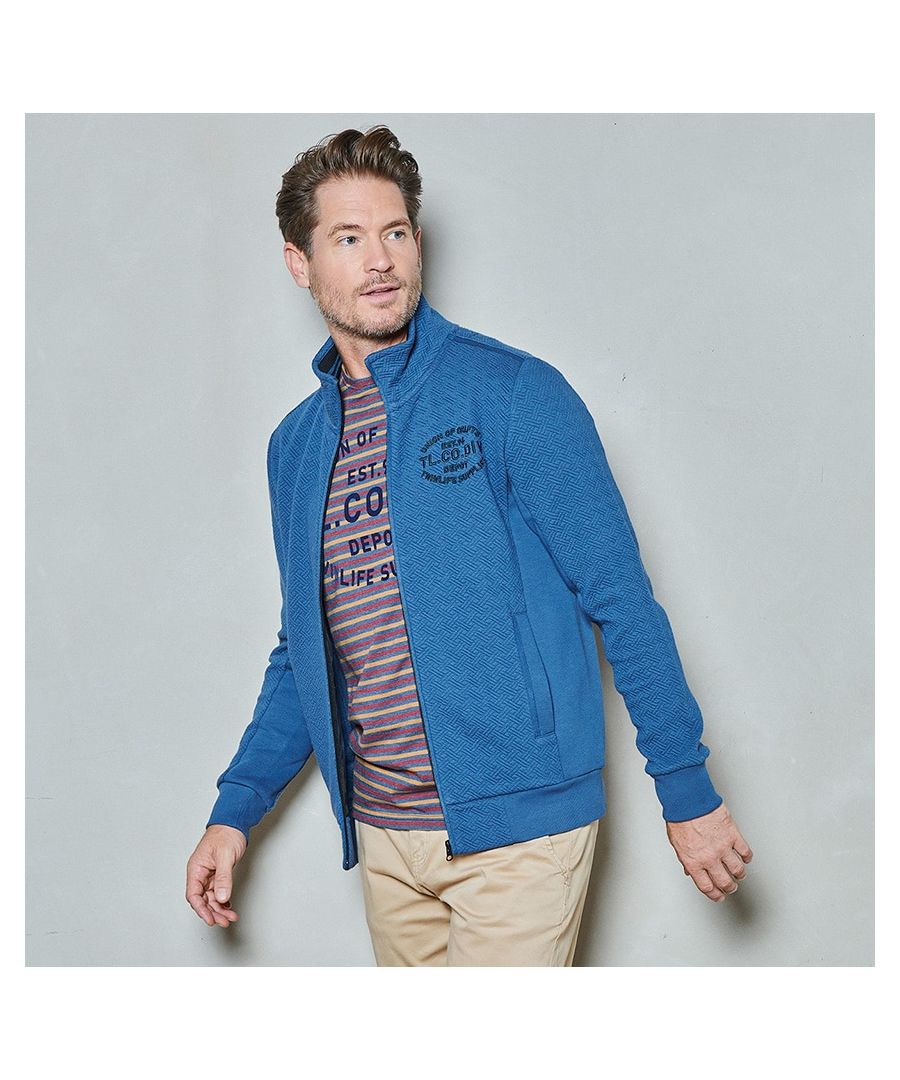Deze zipper sweater is gemaakt van 60% katoen en 40% polyester en heeft een speciale structuur. De pasvorm is regular fit en heeft een subtiele borduur op de borst. De zijkanten zijn van normale sweat en de zakken zijn afsluitbaar door middel van een drukknoop. De boorden zijn afgewerkt met een rib voor extra comfort en betere fit. Ons model is 1,85 en draagt maat M