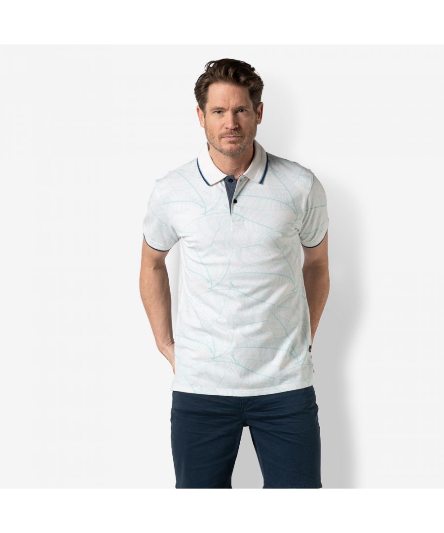 Deze geprinte polo met korte mouwen is gemaakt van 95% BCI katoen en 5% lycra pique. De kraag en afwerking mouwen zijn gebreid met contrast details. Aan de binnenkant zitten chambray details en op de sluiting met 2 knopen zit een contrast tape gestikt. Aan de onderkant is een klein label geplaatst. De pasvorm is regular fit.