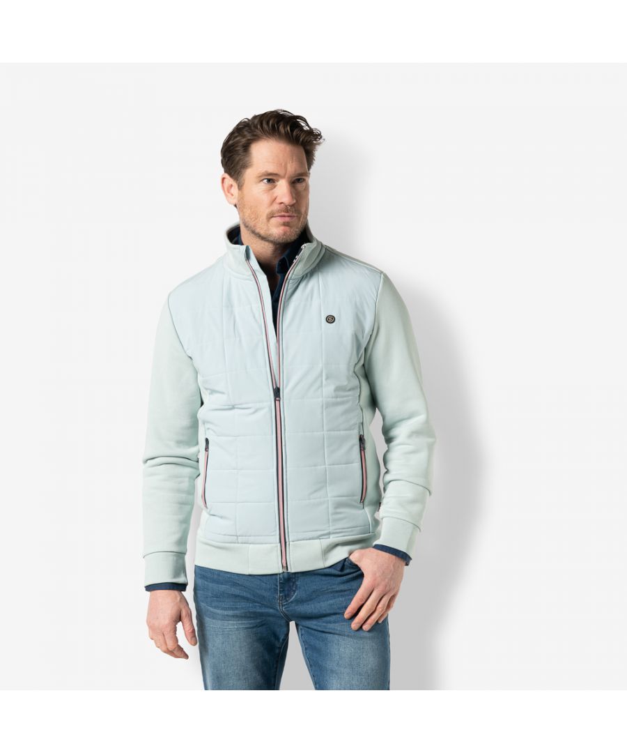Deze zipper sweater is gemaakt van 60% katoen en 40% polyester en heeft een gewatteerde voorkant van softshell met een fancy rits als sluiting. De pasvorm is regular fit en heeft een subtiele borduur op de borst. De zijkanten zijn van normale sweat en de zakken zijn afsluitbaar door middel van een kleurrijke rits. De boorden zijn afgewerkt met een rib voor extra comfort en betere fit.