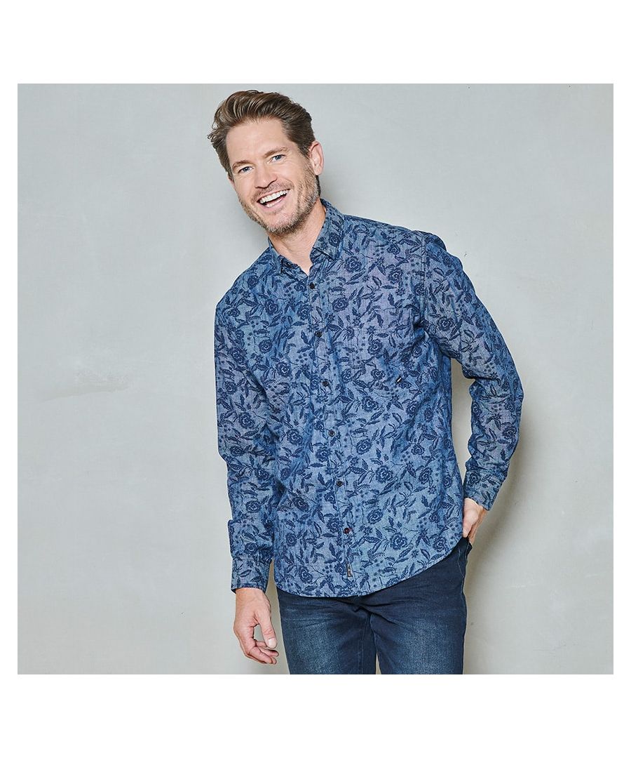 Dit stoere overhemd met lange mouw is gemaakt van 100% cotton indigo chambray 6 Oz en heeft een borstzak met een klein label. De kraag is button down (verborgen) en de onderste knoop is aangezet met ene contrast garen en ook het knoopsgat is met een contrast kleur gestikt. Achterop de kraag bevindt zich ook een kleine knoop. Binnenin de kraag en manchet bevindt zich een contrast piping. De pasvorm is regular fit. Ons model is 1,85 en draagt maat M