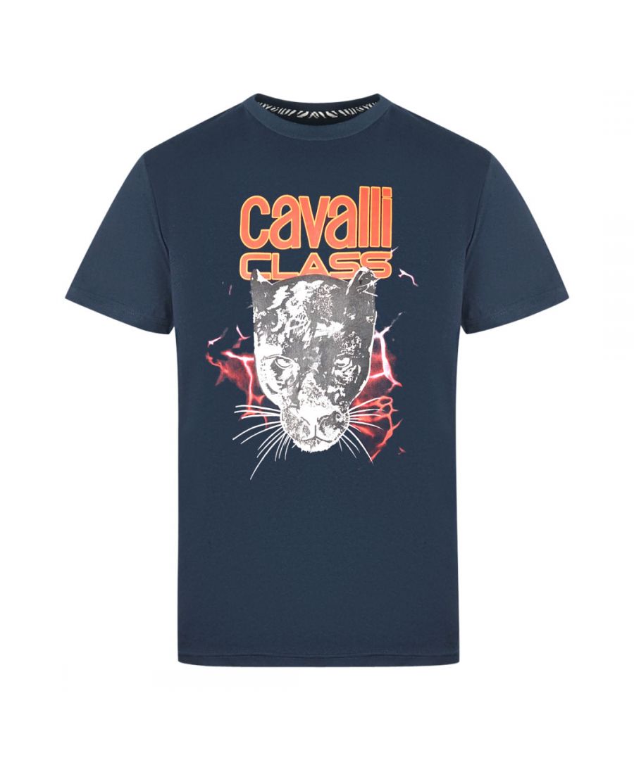Cavalli Class Lightning Panther Design Navy T-Shirt. This Roberto Cavalli black panther Logo Print navy T-Shirt is designed with precision and crafted from 100% cotton for a comfortable fit. It features a classic crew neck, short sleeves, and regular fit that fits true to size. The bold logo and panther head design give it an eye-catching flair, making it perfect for any wardrobe.. Crew Neck, Short Sleeves, Cavalli Class Navy Blue Tee. 100% Cotton, Panther Head Design, Bold Logo, Lighnting Design. Regular Fit, Fits True To Size. Style Code: QXT61J JD060 04926