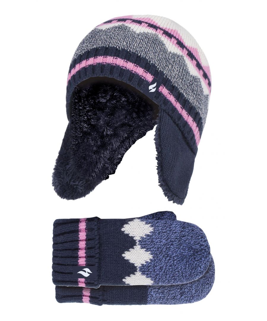 Zeg vaarwel tegen koude winterdagen met deze mutsen en wanten met noords patroon voor meisjes. Of je dochter nu sneeuwengeltjes maakt of geniet van een wandeling in de sneeuw, deze muts en wanten houden hun hoofdjes en handjes gegarandeerd warm! Deze serie mutsen en wanten voor meisjes is voorzien van Heatweaver-isolatie, een zachte, bontachtige voering die de hoeveelheid warme lucht maximaliseert die dicht bij de huid wordt gehouden, waardoor de hoofden, oren en handen van uw kinderen langer warm blijven! Heat Holders staan bekend om hun ongelooflijk warme gebruik van materialen, met name hun ontwikkelde thermo garen dat een hoogwaardige isolatie tegen kou biedt met superieure vochtademende eigenschappen. Deze mutsen en wanten zijn vervaardigd met een rekbare constructie en vormen zich rond de natuurlijke vorm van het hoofd en de handen van uw kind voor een betere, verbeterde pasvorm. Met hi-tech HeatWeaver® thermo voering om kinderen warm te houden, zelfs in de meest koude omstandigheden, is deze reeks mutsen en wanten warm, comfortabel en stijlvol! Voor de perfecte winterlook zijn deze mutsen en wanten voor meisjes geweven met een Scandinavisch patroonthema om elk winterensemble compleet te maken! Ze hebben een bijpassend kleurblokontwerp voor een leuke en stijlvolle fashion statement! Ze hebben een roze streep over de manchet op de polsen en rond de hoed. Deze wanten hebben een lange omgeslagen manchet die u kunt aanpassen aan de polsmaat van uw kind. De wanten hebben ook een royaal gebied voor de handen van uw kind. Ze hebben ook een zachte thermo geborstelde binnenvoering die warmte en comfort maximaliseert. De lange oren passen comfortabel om de oren om warmte en warmte dicht bij de huid vast te houden. - Heat Holders Isolatie - Pom Pom Detail - 2 kleuren - 3-6 jaar