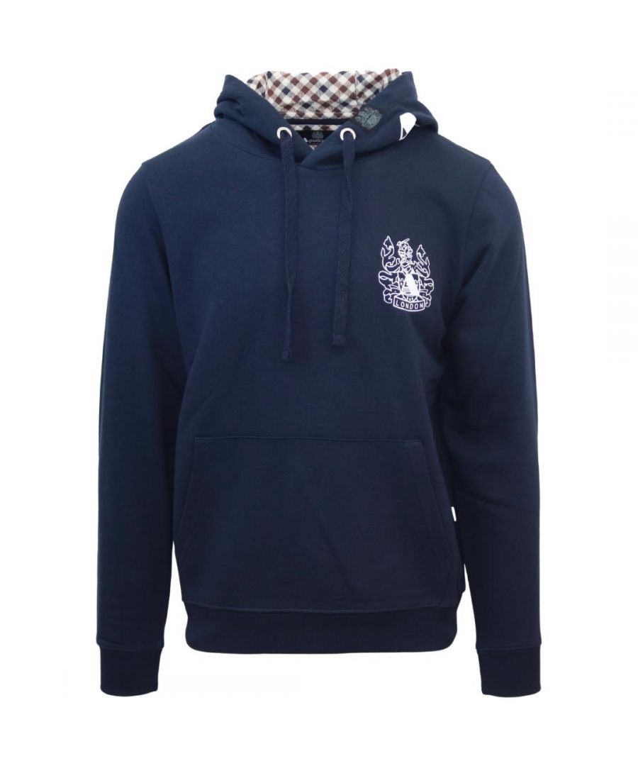 Aquascutum Branded Hood Navy Blue Hoodie. This brand Logo Navy Blue Hoodie from Aquascutum is the perfect blend of fashionable and functional. It's made of a lightweight, breathable fabric and has a stylish logo detail that elevates any casual look. Stay warm and stylish today with Aquascutum!. Elasticated Sleeve Ends and Waist, Drawstring Hood. 100% Cotton Hooded Jumper, Large Kangaroo Pocket. Regular Fit, Fits True To Size. Style Code: FC1023 85
