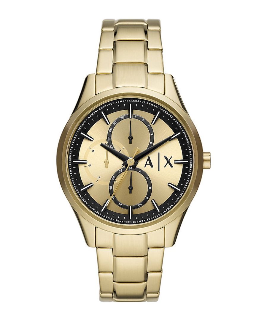 Dit Armani Exchange Heren horloge beschikt over een Quartz binnenwerk. De kast (42 mm mm) is vervaardigd uit RVS (Goudkleurig) en heeft een Mineraalglas. De band is Goudkleurig RVS. Dit horloge uit de Armani Exchange Dante reeks is een mooi en tijdloos geschenk. Verras jezelf of iemand anders met dit cadeau. Bovendien geniet u hierbij van 2 jaar garantie tegen alle fabricagefouten.