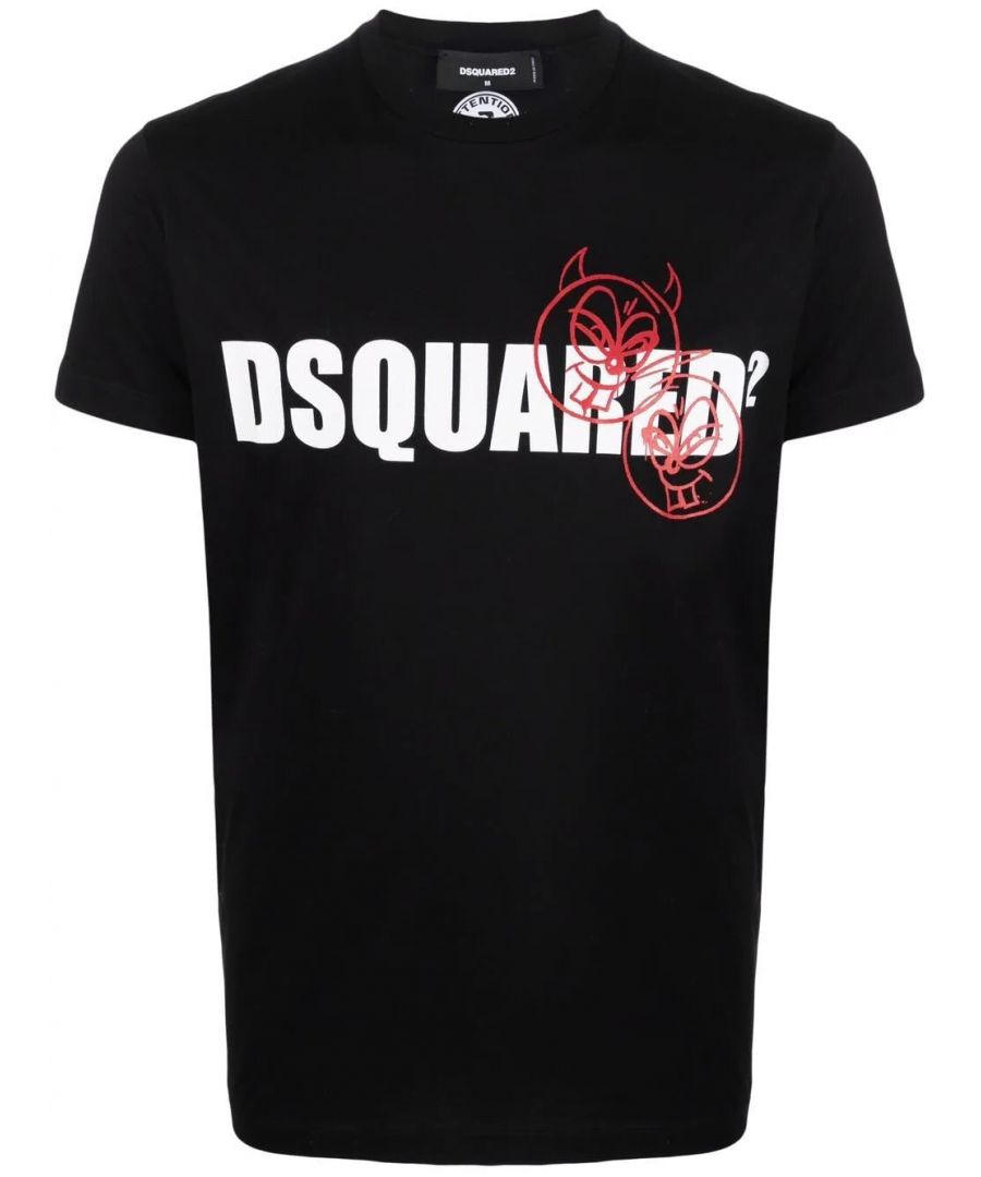De aansprekende motieven van Dsquared2 blijven de collecties van het merk bepalen, zoals blijkt uit dit zwarte T-shirt. Naast een grafische print wordt dit kledingstuk met ronde hals geaccentueerd met een rood/wit getint logo aan de voorkant. zwart/wit/rood katoenen jersey gebreide logoprint op de voorkant ronde hals korte mouwen rechte zoom