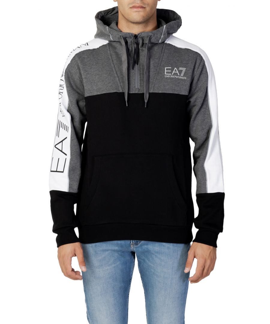 Mens Emporio Armani EA7 Tape Hoody in grey black.- Drawcord-adjustable hood.- Half zip fastening.- Kangaroo pocket.- Ribbed cuffs and hem.- Regular fit.- 84% Cotton 16% Polyester.- Ref: 6LPM15J07Z1200