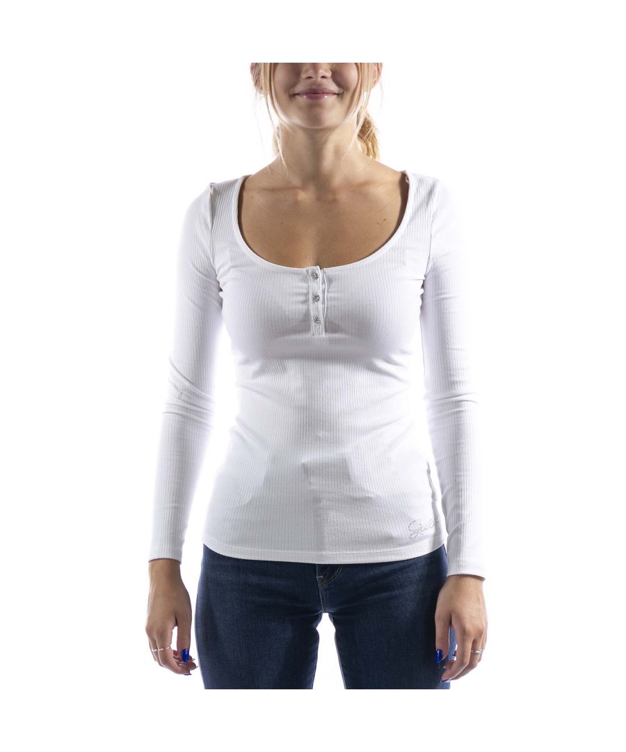Specificaties: Top van geribbelde viscose met ronde halslijn, sierknoopsluiting, lange mouwen en strass-logo op de voorkant aangebracht Pasvorm: Slank Het model draagt maat: XS Lengte van het model: 170 cm