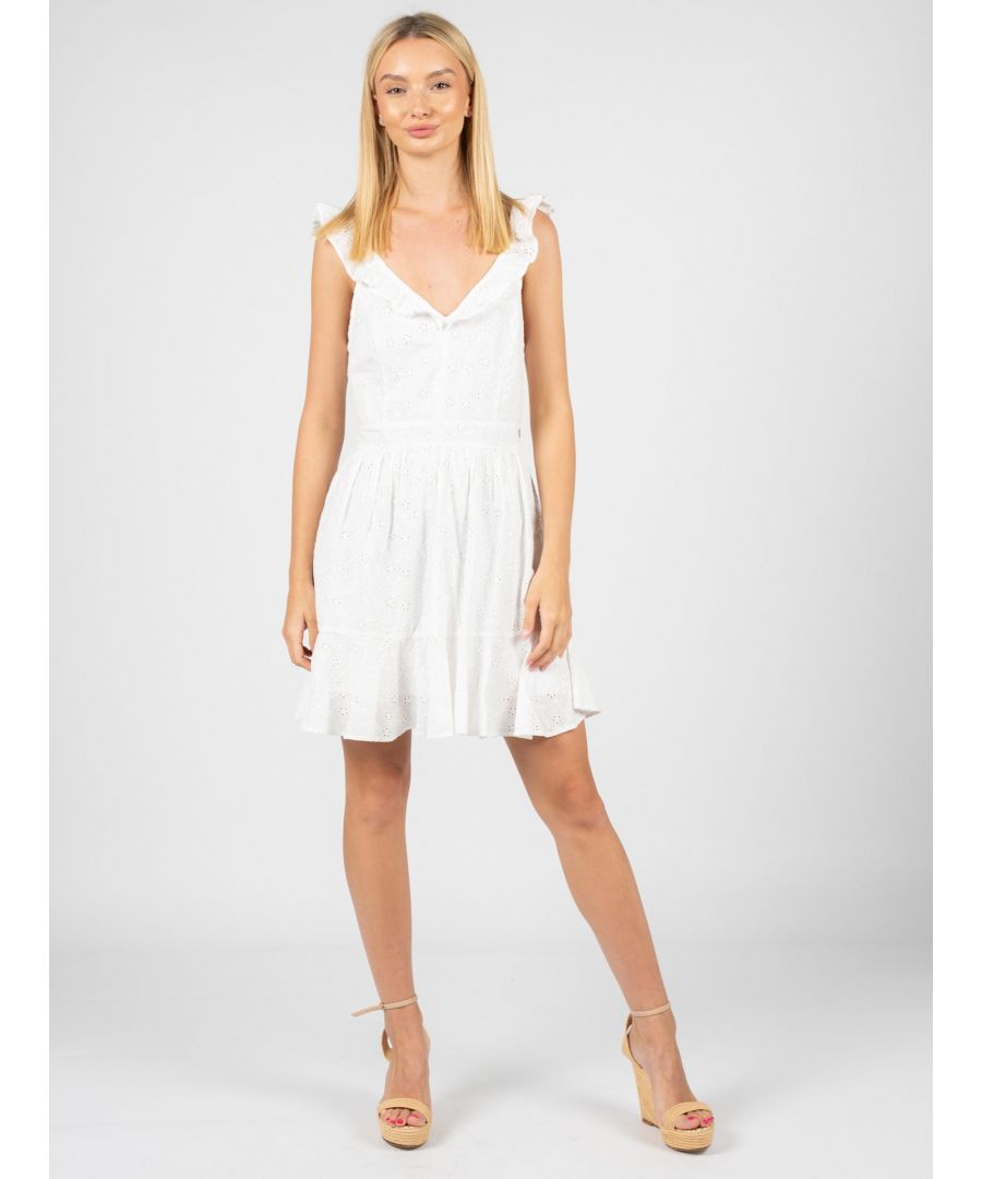 Bovenkant strak, onderkant losjes Mini lengte, tot halverwege het dijbeen Opvallende textuur Versierd met bloemenborduursel Aan de linkerkant gesloten met verborgen rits Met een elastiek aan de achterkant voor gemakkelijk aantrekken Met voering V-hals Met ruches op de bandjes In de taille een gesneden detail De onderkant is afgewerkt met een ruche Links in de taille een merkdetail Gemaakt van hoogwaardig katoen