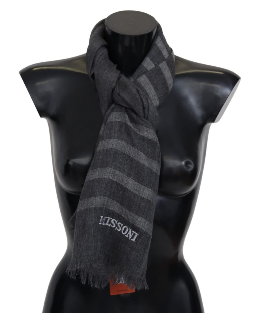 MISSONI Superbe écharpe en laine Missoni 100% authentique, neuve et étiquetée, avec un motif à rayures et le logo de la marque brodé. Matériau : 100% laine Couleur : Gris Sexe : Unisexe Franges Détails du logo Fabriqué en Italie TAILLE : 170cm x 50cm