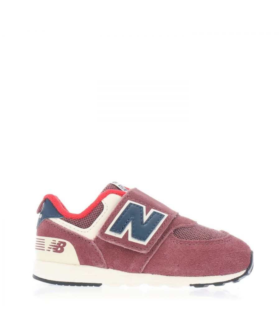 Kids New Balance 574 New-B Hook And Logo Trainers in burgundy.- Hook-and-loop closure.- Flexible construction.- Oversized “Nin branding.- Generous toe box and instep to accommodate and support a first-walker's needs.- Rubber outsole.- Ref.: NW574NX1