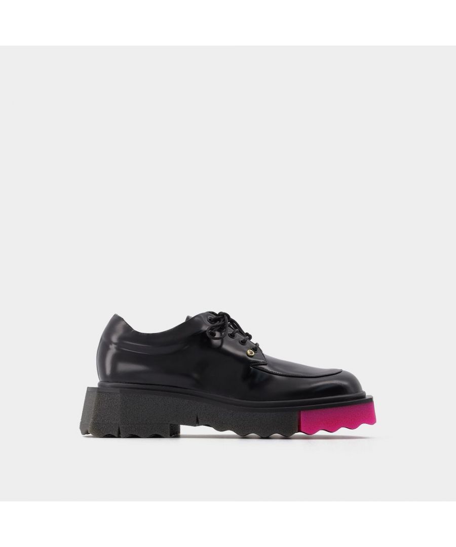 Deze derby's uit de nieuwste schoenencollectie Off White zijn een briljante combinatie van elegantie, comfort en originaliteit. We houden van hun klassieke look en luxueuze gladde leer, evenals hun dikke rubberen zool die doet denken - niet zonder een vleugje ondeugendheid - aan het ontwerp van een spons. Draag ze bij een ultra-gesofisticeerd broekpak en voeg een vleugje fantasie toe met deze unieke derby's. Kleur: Zwart - Zwart Geen Kleur. Hoofdmateriaal: glad kalfsleer. Materiaal Zool: Leer. Materiaal voering: leer. Sluiting: veters bovenaan. Tipvorm: rond. Schoenen: true to size - Maat: Italiaans.