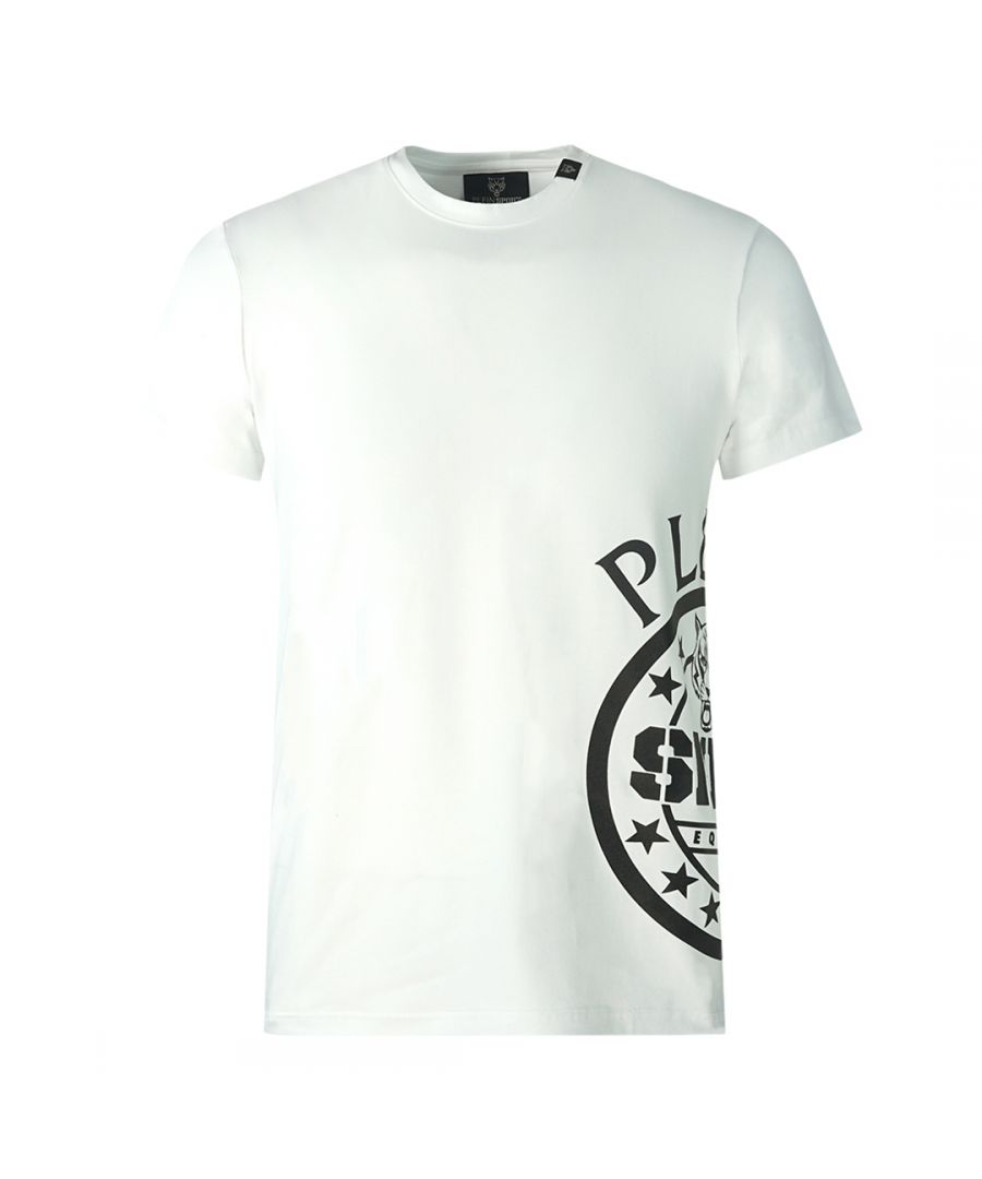 Philipp Plein Sport Side Logo wit T-shirt. Philipp Plein sport wit T-shirt. Stretch pasvorm 95% katoen, 5% elastaan. Gemaakt in Italië. Plein Sport groot merklogo. Stijlcode: TIPS129IT 01