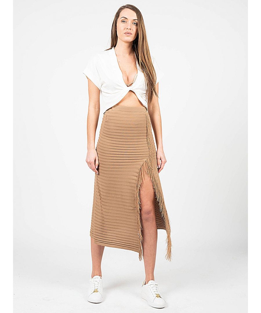 Passende pasvorm Potloodsnit Midi-lengte, tot halverwege de kuit Opvallende textuur Elastische band in de taille Diepe split aan de linkerkant Split versierd met franjes Gemaakt van hoogwaardige stof.