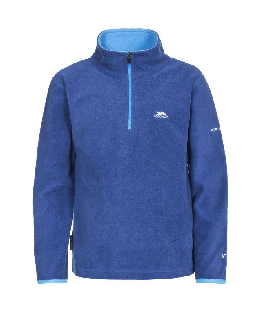 Luchtdicht 1/2 rits in Contrastkleur Contrastband op de manchetten Contrast met de binnenste kraag 100% Polyester Microfleece Borstomvang Trespass Kindermaat (ongeveer): 2/3 jaar - 53 cm, 3/4 jaar - 56 cm, 5/6 jaar - 61 cm, 7/8 jaar - 66 cm, 9/10 jaar - 71cm, 11/12 jaar - 79cm.
